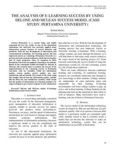 Burhan, Mafazi (2022) The analysis of e-learning success by using delone and mclean success model (case study: pertamina university). Proceeding The Second International Conference on Humanities, Education, Language and Culture (2nd ICHELAC). pp. 29-34. ISSN 2961-8258