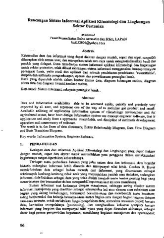 Ketersedian data dan informasi yang dapat diakses dengan mudah, cepat dan tepat sangatlah diharapkan oleh semua user, dan merupakan salah satu cara untuk mengsosialisasikan hasil dan produk yang didapat. Guna tersedianya sistem informasi aplikasi klimatologi dan lingkungan untuk sektor pertanian, telah dibuat rancangan sistem informasi menggunakan konsep rekayasa perangkat lunak, yaitu studi dan aplikasi dari sebuah pendekatan-pendekatan 'cuantifiable', disiplin dan sistimatis pengembangan, operasi dan pemeliharaan perangkat lunak. Hasil yang diperoleh adalah dalam bentuk kamus data, diagram hubungan entitas, diagram aliran data dan diagram transisi keadaan sistem.