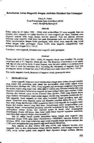 Clara, Y. Yatini (2007) Keterkaitan awan magnetik dengan aktivitas matahari dan geomagnet. In: Sains atmosfer & iklim, sains antariksa serta pemanfaatannya. LAPAN, Jakarta, pp. 103-107. ISBN 978-979-1458-11-5