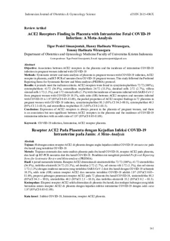Tigor, Peniel Simanjuntak and Hanny, Hadinata Wiranegara and Temmy, Hadi (2022) ACE2 Receptors finding in placenta with intrauterine fetal COVID-19 Infection: A Meta-Analysis. Obgynia : Indonesian Journal of Obstetrics & Gynecology Science, 5 (2). pp. 161-169. ISSN 2615-496X