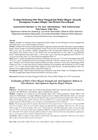 Sarnisyah, Dwi Martiani and St. Nur, Asni, and Abdul, Rahman (2022) Evaluasi kekuatan otot dasar panggul dan <i>defek sfingter</i> ani pada perempuan trauma <i>sfingter ani obstetri pasca repair</i>. Obgynia: Indonesian Journal of Obstetrics and Gynecology Science, 5 (2). pp. 184-192. ISSN 2615-496X