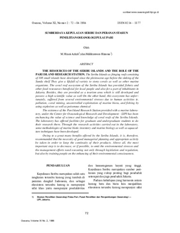 THE RESOURCES OF THE SERIBU ISLANDS AND THE ROLE OF THE PARI ISLAND RESEARCH STATION. The Seribu Islands as fringing reefs consisting of 108 small islands have developed since the pleistocene age before the sinking of the Sunda shelf They give a lifefull of variety to stony corals as well as other marine organisms. The coral reef ecosystem of the Seribu Islands has provided fishery and other food reseources beneficial for local people and also for a part of inhabitants in Jakarta. Besides, they are provided as a tourism area which is still developed and possess a high scientific value as well On the other hand, this ecosystem has unfortunately, suffered from several environmental stresses due to human activities ie. pollution, coral mining, uncontrolled exploitation of marine biota, and fishing by using explosives as well as poisonous chemical.