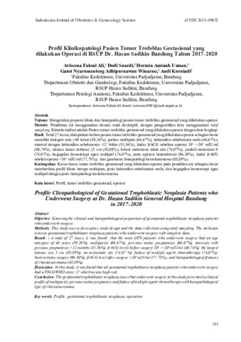 Aviscena, Fahmi Ali and Hermin, Aminah Usman and Dodi, Suardi (2022) Profil klinikopatologi pasien tumor trofoblas gestasional yang dilakukan operasi di RSUP Dr. Hasan Sadikin Bandung tahun 2017–2020. Obgynia: Indonesian Journal of Obstetrics and Gynecology Science, 5 (2). pp. 193-200. ISSN 2615-496X