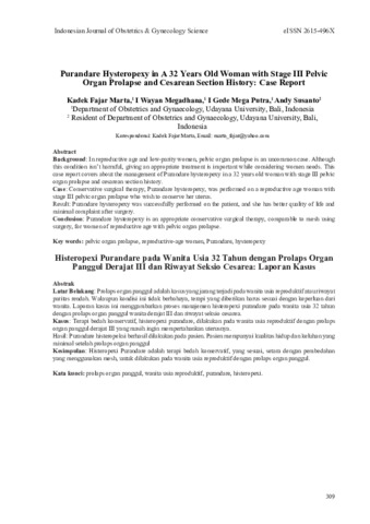 Kadek, Fajar Marta and I Wayan, Megadhana and I Gede, Mega Putra (2022) Purandare hysteropexy in A 32 years old woman with stage iii pelvic organ prolapse and cesarean section history: case report. Obgynia: Indonesian Journal of Obstetrics and Gynecology Science. pp. 309-314. ISSN 2615-496X