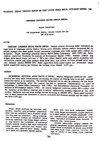 Keadaan alamiah khususnya kadar radioaktif dan logam berat di Lingkungan sekitar Reaktor Serpong perlu diketahui sebelum reaktor beroperasi Hal ini menjadi pegangan atau dasar apakah terjadi pencemaran lingkungan atau tidak selama nanti reaktor itu beroperasi. Dengan metodologi penentuan menurut Health Safety Laboratory, HASI, (1982) dan Radiochemical Analytical Procedures for analysis of Enviromental Semples (1980), keadaan alamiah yang didapat dalam daerah dengan jari-jari; 500 m dari lokasi Reaktor serba guna adalah disebabkan oleh radionuklida alamiah yang biasa terdapat dalam kerak bumi. Laju sinaran terletak dibawah nilai ratarata-ratamaksimum menurut UNSCEAR 1972. Kadar logam berat dalam sumber-sumber air ditentukan dengan metode pengaktifan neutron dan Dithizon dan terdapat nilai dibawah 0,005 ppm.