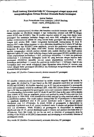 SC (sudden commencement) dicirikan oleh kenaikan mendadak intensitas medan magnet. SC dalam makalah ini dibedakan menjadi 2 tipe berdasarkan orientasi arah IMF Bz dengan notasi SC(SI) dan SC(SSC). Tipe SI (sudden impulse) adalah SC yang tidak disertai badai geomagnet dan umumnya berkaitan dengan arah utara IMF, sedangkan tipe SSC (Storm Sudden Commencement) adalah SC yang disertai badai geomagnet dan umumnya berkaitan dengan arah selatan IMF. Untuk mengetahui karakteristik masing-masing SC (bail SI maupun SSC) maka dalam kegiatan ini akan dilakukan identifikasi ke-3 kriteria SC baik tipe SC(SI) maupun tipe SC(SSC) yaitu amplitudo, perioda dan gradiennya menggunakan data komponen H stasiun Biak tahun 1994-1998. Setelah diidentifikasi kemudian dilakukan analisis menggunakan metode analisis statistik yaitu analisis distribusi data. Hasil analisis diperoleh bahwa SC yang tidak berkaitan dengan badai geomagnet (SC(SI)) memiliki ciri-ciri umum amplitudonya terdistribusi > 8nT, periodanya terdistribusi < 4 menit dan gradiennya terdistribusi > 2.2nT/menit. Sedangkan untuk SC yang berkaitan dengan kejadian badai geomagnet (SC(SSC)) memiliki ciri-ciri umum amplitudonya terdistribusi > 10nT, periodanya terdistribusi < 4 menit dan gradiennya terdistribusi > 2.7nT/menit. Hasil di atas merupakan hasil awal untuk selanjutnya dapat digunakan dalam deteksi SC terutama yang terkait dengan badai geomagnet (SC(SSC)) dan berikutnya mengembangkan sistem deteksi otomatis badai geomagnet.