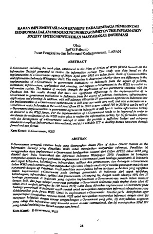 E-Government termasuk rencana kerja yang dicanangkan dalam Plan of Action (World Summit on the Information Society) yang dihasilkan WSIS untuk mewujudkan masyarakat informasi. Penelitian . ini menggunakan data implementasi e-Government berdasarkan instansi dari Ditjen APTEL tahun 2010 yang diambil dari: Buku Komunikasi dan Informasi Indonesia Whitepaper 2010. Penelitian ini bertujuan mengetahui apakah terdapat perbedaan implementasi e-Government pada lembaga pemerintah di Indonesia dari aspek kebijakan, kelembagaan, infrastruktur, aplikasi dan perencanaan, dan dukungan e-Government dalam WSIS untuk memuwujudkan masyarakat informasi. Metode analisisnya melalui penerapan statistik non parametrik dengan uji Friedman. Hasil penelitian menunjukkan bahwa terdapat perbedaan yang signifikan dalam implementasi e-Government pada lembaga pemerintah di Indonesia dari aspek kebijakan, kelembagaan, infrastruktur, aplikasi dan perencanaa n. Disamping itu, dengan masih adannya 48% dari 27 lembaga pemerintah di Indonesia yang capaian implementasi e-Government-nya masih belum berhasil dengan baik, dan juga adanya penurunan peringkat e government Indonesia pada tingkat dunia (dari 85 peringkat ke-109 tahun 2010) maka dapat dikatakan implementasi e-Government pada Iembaga pemerintah di Indonesia masih rendah untuk memujudkan masyarakat informasi sebagaimana yang deklarasikan pada forum WSIS. Untuk itu implementasi e-Government tersebut perlu ditingkatkan agar menyusun kebijakan agar mempercepat terwujudnya rencana tindak WSIS untuk mewujudkan masyarakat informasi, dengan cara: (a) menyusun kebijakan dengan pengembangan e-Government yang jelas, (b) menyediakan anggaran yang memadai sesuai standar internasional, dan (c) meningkatkan SDM ICT yang handal melalui jalur fonnai maupun non formal.