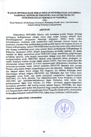 Dibentuknya DEPANRI didasari oleh kesadaran pendiri bangsa terhadap pentingnya kedirgantaraan sebagai matra yang sangat strategis menjadi dasar dikembangkannya penguasaan teknologi dirgantara. Dalam kurun waktu keberadaannya, meskipun telah memberikan hasil beberapa rumusan konsep dan pemberian masukan bagi pembentukan produk-produk hukum dan kegiatan lainnya di bidang kedirgantaraan, namun DEPANRI belum memberikan peran yang cukup berarti atau kurang memberikan peran yang optimal dalam pembangunan kedirgantaraan di Indonesia, khususnya terkait dengan pengembangan peroketan nasional. Di dalam makalah ini dikaji optimalisasi peran DEPANRI dalam mendukung pengembangan peroketan nasional, yaitu dengan menentukan strategi yang akan dilakukan dalam mengoptimalkan peran DEPANRI. Metode yang digunakan dalam pengkajian ini adalah deskriptif analisis dengan tehnik analisis SWOT. Dari hasil kajian diperoleh rekomendasi sebagai berikut: (i) Untuk mempermudah dilakukannya koordinasi dan pertemuan-pertemuan secara intensif pelaksana DEPANRI dipimpin oleh seorang Menteri yang terkait dengan pengembangan sains dan teknologi, Sedangkan Presiden dan Menteri terkait hanya sebagai Tim Pengarah; (ii) Menteri Keuangan harus ditambahkan sebagai anggota DEPANRI; (iii) Sekretariat dan Tim Teknis harus mengambil peran besar, dan selalu berinisiatif menjalankan kegiatan-kegiatan DEPANRI; (iv) Perlu dibentuk Tim Teknis/Kelompok Kerja Peroketan di tubuh DEPANRI agar kebijakan-kebijakannya dapat dijabarkan lebih teknis, dan pelaksanaannya dapat terus diawasi; (v) Pokja peroketan anggota-anggotanya merupakan perwakilan dan masing-masing instansi anggota DEPANRI, dan dapat ditambah dengan pakar-pakar dari perguruan tinggi maupun pihak industri /swasta; dan (vi) Program besar seperti pengembangan Roket Pengorbit Satelit (RPS), dilaksanakan berdasarkan kebijakan nasional/DEPANRI, bukan hanya kebijakan LAPAN sendiri.