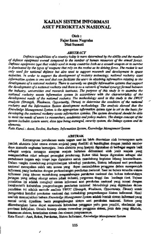 Kemampuan pertahanan suatu negara saat ini lebih ditentukan oleh kemampuan serta jumlah alutsista (alat utama sistem senjata) yang dimiliki di bandingkan dengan jumlah sumber daya manusia angkatan bersenjata. Jenks alutsista yang banyak digunakan di berbagai negara baik sebagai senjata serangan ataupun senjata bertahan didominasi oleh jenis senjata yang mengandalkan roket sebagai perangkat pendorong. Roket tidak hanya digunakan sebagai alat pertahanan negara saja tetapi juga digunakan untuk mendukung kegiatan litbang keantarlksaan. Dalam rangka mendukung pengembangan teknologi peroketan, Sistem informasi aset peroketan nasional merupakan salah satu sarana yang dapat memudahkan pengguna dalam memperoleh informasi yang berkaitan dengan perkembangan peroketan nasional. Saat ini belum tersedia sistem informasi yang khusus mendukung pengembangan peroketan nasional dan belum terbentuknya jaringan yang saling sinergi antara pihak industri, perguruan tinggi dan lembaga riset. Tujuan penelitian ini adalah mengkaji sistem informasi aset peroketan nasional yang sesuai dengan karakteristik kebutuhan pengembangan peroketan nasional. Metodologi yang digunakan dalam penelitian ini adalah motode analisis SWOT (Strength, Weakness, Opportunity, Threat) untuk mengetahui kondisi peroketan nasional dan metodologi pengembangan Sistem Informasi. Hasil analisis menunjukkan bahwa Knowledge Management System adalah bentuk sistem informasi yang sesuai untuk dijadikan basis pengembangan sistem aset peroketan nasional. Sistem yang dikembangkan harus dapat memenuhi kebutuhan pengguna yaitu para peneliti, akademisi dan pembuat kebijakan. Desain konsep sistem mencakup pengguna sistem, jenis data yang dlkelola, keamanan sistem, keterkaitan sistem dan elemen penyusunnya.