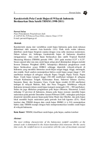 Karakteristik utama dari variabilitas curah hujan Indonesia pada skala tahunan didominasi oleh monsun Asia-Australia (AA). Pada skala waktu tahunan, distribusi curah hujan bergerak sejalan dengan zona suhu musiman maksimum. Dalam tulisan ini, beberapa karakteristik hujan di Indonesia dianalisis menggunakan data curah hujan berdasarkan data satelit Tropical Rainfall Measuring Mission (TRMM) periode 1998 - 2011 pada resolusi 0.25 x 0.25.Secara spasial nilai rata-rata curah hujan setiap pixel diinterpolasi dengan metode Inverse Distance Weighted (IDW). Selanjutnya dilakukan pengkelasan curah hujan berdasarkan acuan BMKG sehingga diperoleh wilayah-wilayah di Indonesia yang memiliki Intensitas curah hujan sangat tinggi, tinggi, menengah, dan rendah. Hasil analisis menunjukkan bahwa curah hujan sangat tinggi (> 401 mm/bulan) terdapat di sebagian wilayah Papua Tengah, Papua Timur, Papua Barat. Curah hujan kategori tinggi (301-400 mm/bulan) terdapat di sebagian