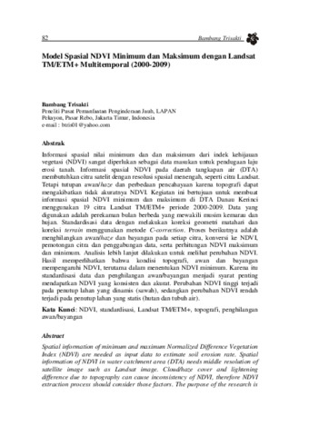 Bambang, Tri Sakti (2015) Model spasial NDVI minimum dan maksimum dengan Landsat TM/ETM+ Multitemporal (2000-2009). In: Bunga rampai penginderaan jauh Indonesia 2013. Pusat Penginderaan Jauh, Institut Teknologi Bandung, Bandung, pp. 82-94. ISBN 978-602-19911-3-8