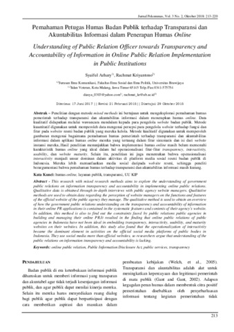 Syaiful, Azhary and Rachmat, Kriyantono (2018) Pemahaman petugas humas badan publik terhadap transparansi dan akun tabilitas informasi dalam penerapan humas online. Jurnal Pekommas, 3 (2): 10. pp. 213-220. ISSN 2502-1893