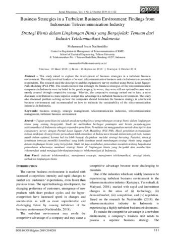 Muhammad, Imam Nashiruddin (2019) Business strategies in a turbulent business environment: findings from Indonesian telecommunication industry. Jurnal Pekommas, 4 (2): 1. pp. 111-122. ISSN 2502-1893