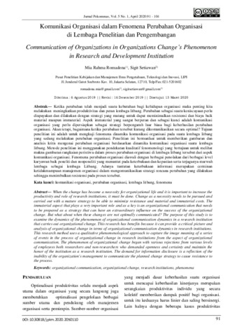 Mia, Rahma Romadona and Sigit, Setiawan (2020) Komunikasi organisasi dalam fenomena perubahan organisasi dilembaga penelitian dan pengembangan. Jurnal Pekommas, 5 (1): 10. pp. 91-104. ISSN 2502-1893