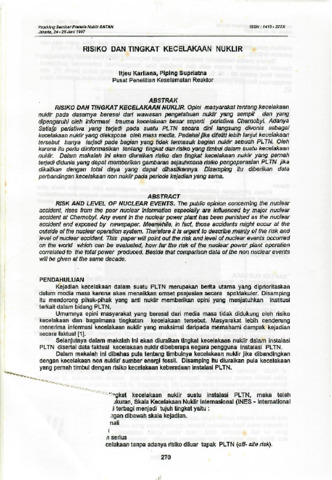 Opini masyarakat tentang kecelakaan nuklir pada dasarnya berasal dari wawasan pengetahuan nuklir yang sempit dan yang dipengaruhi oleh informasi trauma kecelakaan besar seperti peristiwa ChemobyL Adanya Set i a [p peristiwa yang terjadi pada suatu PLTN secara dini langsung divonis sebagai kecelakaan nuklir yang diekspose oleh mass media. Padahal jika diteliti lebih lanjut kecelakaan tersebut hanya terjadi pada bagian yang tidak termasuk bagian nuklir sebuah PLTN. Oleh karena itu perlu diinformasikan tentang tingkat dan risiko yang timbul dalam suatu kecelakaan nuklir. Dalam makalah ini akan diuraikan risiko dan tingkat kecelakaan nuklir yang pernah terjadi didunia yang dapat memberikan gambaran sejauhmana risiko pengoperasian PLTN jika dikaitkan dengan total daya yang dapat dihasilkannya. Disamping itu diberikan data perbandingan kecelakaan non nuklir pada periode kejadian yang sama.