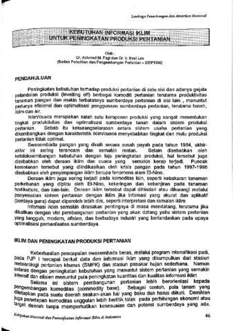 Peningkatan kebutuhan terhadap produksi pertanian di satu sisi dan adanya gejala pelandaian produksi (levelling off) berbagai komoditi pertanian terutama produktivitas tanaman pangan dan makin terbatasnya sumberdaya pertanian di sisi lain, menuntut perlunya efisiensi dan optimalisasi penggunaan sumberdaya pertanian, terutama tanah, iklim dan air. Iklim/cuaca merupakan salah satu komponen produksi yang sangat menentukan tingkat produktivitas dan optimalisasi sumberdaya tanah dalam sistem produksi pertanian. Sebab itu kekurangselarasan antara sistem usaha pertanian yang dikembangkan dengan karakteristik iklim/cuaca menyebabkan tingkat dan mutu produksi pertanian tidak optimal. Swasembada pangan yang diraih secara susah payah pada tahun 1984, akhir- akhir ini sering terancam dan semakin rentan. Selain disebabkan oleh ketidakseimbangan kebutuhan dengan laju peningkatan produksi, hal tersebut juga disebabkan oleh deraan iklim dan cuaca yang semakin kerap terjadi. Puncak kerentanan tersebut yang diindikasikan oleh krisis pangan pada tahun 1997-1998 disebabkan oleh penyimpangan iklim berupa fenomena alam El-Nino. Deraan iklim juga sering terjadi pada komoditas lain, seperti kebakaran tanaman perkebunan yang dipicu oleh El-Nino, kekeringan dan kebanjiran pada tanaman hortikultura, dan lain-lain. Deraan iklim tersebut dapat dihindari atau dikurangi melalui penyesuaian sistem pertanian dengan iklim jika infomasi yang akurat dan aplikatif (berdaya guna) dapat diperoleh lebih dini, seperti interpretasi dan ramalan iklim Infomasi iklim semakin dirasakan pentingnya di masa mendatang, terutama jika dikaitkan dengan visi pembangunan pertanian yang akan datang yaitu sistem pertanian yang tangguh, modem, efisien, dan berbudaya industri yang berlandaskan pada upaya optimalisasi pemanfaatan sumberdaya.