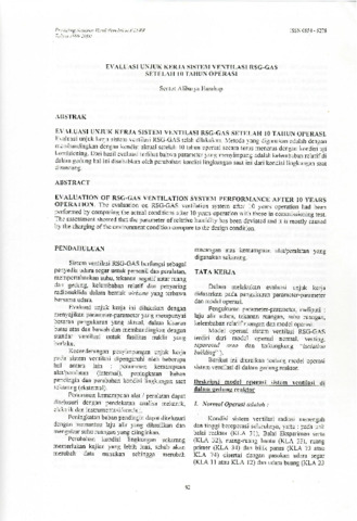 Evaluasi unjuk kerja sistem ventilasi RSG-GAS telah dilakukan. Metoda yang digunakan adalah dengan membandingkan dengan kondisi aktual setelah 10 tahun operasi secara terus menerus dengan kondisi uji komisioning. Dari hasil evaluasi terlihat bahwa parameter yang menyimpang adalah kelembaban relatif di dalam gedung hal ini disebabkan oleh perubahan kondisi lingkungan saat ini dari kondisi lingkungan saat dirancang.