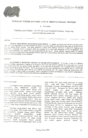 Di Indonesia, pemanfaatan teknik difraksi untuk kristal protein masih relatif muda dibandingkan dengan untuk bahan industri karena ukuran butiran kristal yang relatif besar sehingga diperlukan peralatan difraksikecil dengan resolusi memadai. Dilain pihak, peningkatan publikasi protein database internasional di abad ke-20 mendekati kurva Peningkatan drastis ini merupakan akibat dari pentingnya struktur bahan untuk pemahaman sifat dan pengembangan bahan secara mikroskopik yang akhirnya menunjang bidang kedokteran dan farmasi. Metoda, peralatan, perangkat analisis dan database kistal protein dibahas secara umum sehingga diharapkan dapat menimbulkan kerjasama pemanfaatan teknik difraksi untuk kristalografi dalam segi peraiatan maupun bahannya,