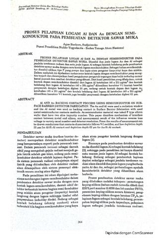 Diambil dua jenis logam Au dan Al sebagai jendela terobosan radiasi dan satu jenis logam Al sebagai kontak belakang pada pembuatan detektor sawar muka dengan cara kontak logam-semikonduktor. Sebagai bahan semikonduktor diambil silikon tipe P yang punya dua lapis atom pengotor (impurity) kaya dan miskin.Dalam makalah ini dijelaskan mekanisme kontak logam dongan semikonduktor yang mungkin terjadi dan disampaikan hasil pengukuran pengaruh tegangan bias balik terhadap nomor kanal puncak dan resolusi detektor yang dibuat. Dari hasil penelitian yang dilakukan, untuk kontak depan semikonduktor diambil dari logam Al ketebalan (40 ± 25) µg/cm² dan kontak belakang dari logam Al ketebalan (40 ± 25) µg/cm² dihasilkan karakter V-I kontak bersifat penyearah dengan ketebalan diplesi 35 µg, sedang untuk kontak depan dan logam Auketebalan (40 ± 25) µg/cm² dan kontak belakang dari logam AJ ketebalan ((40 ± 25) µg/cm² dihasilkan karakter V-I kontak juga bersifat penyearah dengan ketebalan diplesi 62 µg
