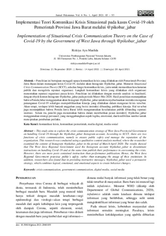 Rizkiya Ayu Maulida (2021) Implementasi teori komunikasi krisis situasional pada kasus Covid-19 oleh pemerintah Provinsi Jawa Barat melalui @pikobar_jabar. Jurnal_Pekommas_, 6 (1): 9. pp. 83-93. ISSN 2502-1983