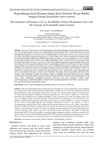 Iwan Asaad and Arwah Rahman (2021) Pengembangan Kota Parepare sebagai Kota Destinasi Wisata Habibie dengan Konsep Sustainable smart tourism. Jurnal Pekommas. pp. 21-33. ISSN 2502-1893