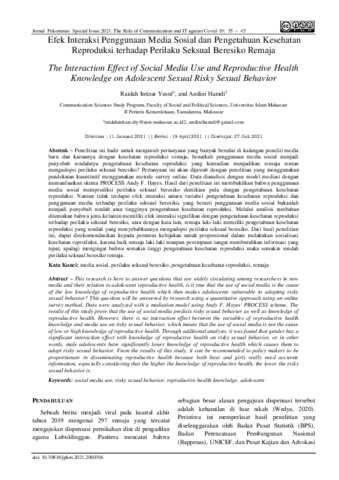 Raidah Intizar Yusuf and Andini Hamdi (2021) Efek interaksi penggunaan media sosial dan pengetahuan kesehatan reproduksi terhadap perilaku seksual beresiko remaja. Jurnal Pekommas: 4. pp. 35-45. ISSN 2502-1893