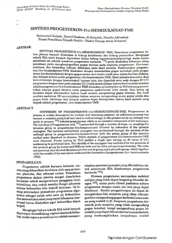 Penentuan progesteron dalam plasma banyak dilakukan di bidang kedokteran dan bidang peternakan. Mengingat teknik RIA telah banyak digunakan dalam bidang reproduksi/endokrinologi, maka tujuan penelitian ini adalah membuat progesteron bertanda ¹²⁵l perlu dilakukan beberapa tahap percobaan yaitu mengkonjugasikan gugus tirosina pada senyawa progesteron- llα-hemisuksinat, dan kemudian iodinasi dilakukan pada hasil sintesis. Pembentukan progesteron- llα-hemisuksinat -TME dilakukan dengan mereaksikan gugus karboksil pada progesteron- llα-hemisuksinat dengan gugus amina dari tirosin metil ester dalam larutan dioksan, dan didapat kristal putih progesteron- llα-hemisuksinat -TME. Hasil sintesis kemudian diuji kemurniannya dengan kromatografi lapisan tipis, dan diperoleh satu noda dengan Rf 0,71 yang sesuai dengan data pada pustaka [1]. Untuk membuktikan bahwa hasil sintesis tersebut adalah progesteron- llα-hemisuksinat -TME dilakukan uji Lowry, dan uji Millon's yang menentukan adanya gugus tirosina serta penentuan spektrometri infra merah. Dari kedua uji tersebut dapat disimpulkan bahwa hasil sintesis mengandung gugus tirosina, dan hasilanalisis spektrum IR menunjukkan bahwa senyawa mengandung suatu gugus amida dan gugus fenol. Akhirnya dari seluruh analisis dapat disimpulkan bahwa hasil sintesis yang terjadi adalah progesteron- llα-hemisuksinat –TME.