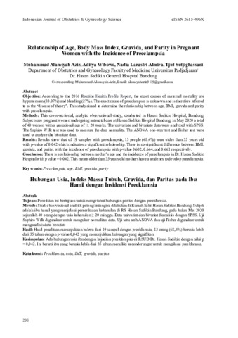 Muhammad, Alamsyah Aziz and Aditya, Wibowo and Nadia, Larastri Almira and Tjut, Sutjighassani (2022) Hubungan usia, indeks massa tubuh, Gravida, dan paritas pada Ibu hamil dengan insidensi preeklamsia. Obgynia: Indonesian Journal of Obstetrics and Gynecology Science, 5 (2): 6. pp. 208-216. ISSN 2615-496X