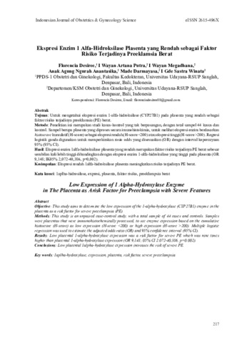 Florencia, Desiree and I Wayan, Artana Putra and I Wayan, Megadhana and Anak Agung, Ngurah Anantasika and Made, Darmayasa and I Gde, Sastra Winata (2022) Ekspresi enzim 1 alfa-hidroksilase plasenta yang rendah sebagai faktor risiko terjadinya preeklamsia berat. Obgynia: Indonesian Journal of Obstetrics and Gynecology Science, 5 (2): 7. pp. 217-225. ISSN 2615-496X