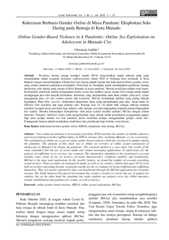 Christiany Juditha (2022) Kekerasan berbasis gender online di masa pandemi: eksploitasi seks daring pada remaja di kota Manado. Jurnal_Pekommas, 7 (1): 1. pp. 1-12. ISSN 2502-1893