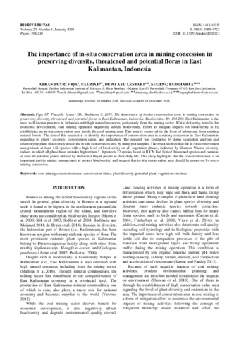 Abban Putri Fiqa and Fauziah and Dewi Ayu Lestari and Sugeng Budiharta (2019) The importance of in-situ conservation area in mining concession in preserving diversity, threatened and potential floras in East Kalimantan, Indonesia. Biodiversitas : journal of biological diversity, 20 (1). p. 198210. ISSN 2085-4722