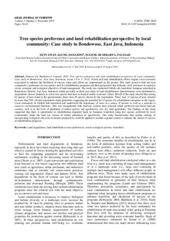 Setyawan, Agung Danarto and Sugeng, Budiharta and Fauziah, Fauziah (2019) Tree species preference and land rehabilitation perspective by local community: Case study in Bondowoso, East Java, Indonesia. Asian Journal of Forestry, 3 (2). pp. 54-63. ISSN 2580-2844
