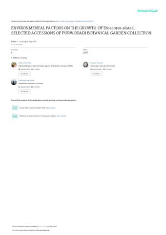 Abban, Putri Fiqa and Titik, Helen Nursafitri and Fauziah, Fauziah and Shofiatul, Mas"udah (2021) Pengaruh faktor lingkungan terhadap pertumbuhan beberapa aksesi Dioscorea alata L. terpilih koleksi Kebun Raya Purwodadi. Jurnal Agro, 8 (1). pp. 25-39. ISSN 2407-7933
