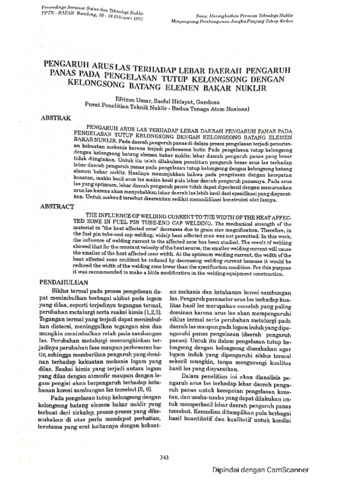 Pada daerah pengaruh panas di dalam proses pengelasan terjadi penurunan kekuatan mekanis karena terjadi perbesaran butir. Pada pengelasan tutup kelongsong dengan kelongsong batang elemen bakar nuklir. lebar daerah pengaruh panas yang besar tidak diinginkan. Untuk itu telah dilakukan penelitian pengaruh besar arus las terhadap lebar daerah pengaruh panas pada pengelasan tutup kelongsong dengan kelongsong batang elemen bakar nuklir. Hasilnya menunjukkan bahwa pada pengelasan dengan kecepatan konstan. makin kecil arus las makin kecil pula lebar daerah pengaruh panasnya. Pada arus las yang optimum. lebar daerah pengaruh panas tidak dapat diperkecil dengan menurunkan arus las karena akan menyebabkan lebar daerah las lebih kecil dan spesifikasi yang disyaratkan.Untuk maksud tersebut disarankan sedikit memodifikasi konstruksi alat lasnya.