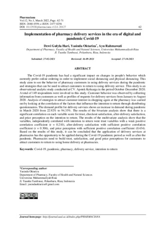 Dewi, Gulyla Hari and Yasinda, Oktariza and Ayu, Rahmawati (2022) Implementation of pharmacy delivery services in the era of digital and pandemic Covid-19. Pharmaciana, 12 (1): 7. pp. 62-71. ISSN 2088-4559