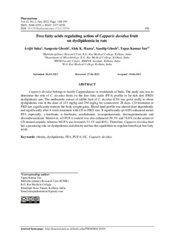 Avijit, Saha and Sangeeta, Ghosh and Alok, K. Hazra and Sandip, Ghosh and Tapas, Kumar Sur (2022) Free fatty acids regulating action of Capparis decidua fruit on dyslipidemia in rats. Pharmaciana: Jurnal Kefarmasian, 12 (2): 6. pp. 188-195. ISSN 2088 4559
