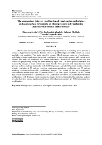 Dian Ayu Juwita and Fitri Rachmaini and Almahdy and Rahmad Abdillah and Yolanda Mayestika Wati (2022) The comparison between combination of candesartan-amlodipine and candesartan-furosemide on blood pressure in hypertensive patients with chronic kidney disease. Pharmaciana: Jurnal Kefarmasian, 12 (2): 9. pp. 218-226. ISSN 2088-4559