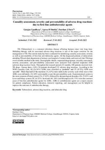 Gunjan, Upadhyay and Apexa, B Shukla and Darshan, J Dave (2022) Causality assessment, severity and preventability of adverse drug reactions due to first-line antitubercular agents. Pharmaciana: Jurnal Kefarmasian, 12 (2): 11. pp. 235-244. ISSN 2088-4559
