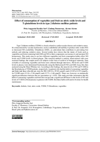 Prita, Anggraini Kartika Sari and Endang, Darmawan and Akrom, Akrom (2022) Effect of consumption of vegetables and fruit on nitric oxide levels and T-glutathione levels in type 2 diabetes mellitus patients. Pharmaciana: Jurnal Kefarmasian, 12 (2): 12. pp. 245-252. ISSN 2088 4559