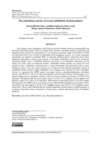 The oxidative stress mechanism in the body involves the balance between increased ROS anddecreased antioxidant agents. ROS can damage DNA, proteins, and lipids, leading to pathology and impaired insulin secretion by dysregulation of several genes expression. High concentrations of ROS are often followed by a low activity of antioxidants from endogenous sources. As a result, exogenous antioxidants are required to neutralize ROS. As reported, medicinal plants, which have had various traditional applications, contain large amounts of secondary metabolites, proven to be exogenous antioxidant agents. Jamu, a traditional medicine, also known as an alternative medication, can be widely and easily found in traditional markets. Antidiabetic herbal products are among the most popular of jamu. Antidiabetic mechanism has a strong relationship with antioxidant roles in many biological systems. The aim of this research was to figure out the potential antioxidant activity of antidiabetic herbal products. Eight antidiabetic jamu samples were analyzed for their antioxidant activity by measuring the DPPH radical scavenging activity, phosphomolybdenum antioxidantactivity, and FRAP, as well as for their total phenolic and flavonoid contents. Good linearity was a general finding for the quantitative analysis, with an average correlation coefficient of 0.999 for the standards. The highest total flavonoid content found was 8.66 ± 0.11 mgQE/g, and the highest total phenolic content was 22.66 ± 0.15 mgGAE/g. With regard to antioxidant activity, all of the samples demonstrated weak DPPH radical scavenging activity, while phosphomolybdenum antioxidant activity and FRAP were the highest at 48.58 ± 0.45 mgQE/g extract and 226.98 ± 0.19 mgQE/g extract, respectively. These results indicated that the claimed antidiabetic herbal products could be prepared as exogenous antioxidant sources, irrespective of being with or without antioxidant activity, for diabetes treatment.