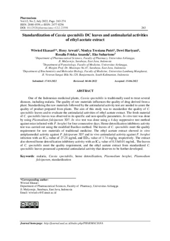 Wiwied Ekasari and Heny Arwati and Nindya Tresiana Putri and Dewi Hariyani and Rosalia Friska Ananda and Eko Suhartono (2022) Standardization of Cassia spectabilis DC leaves and antimalarial activities of ethyl acetate extract. Pharmaciana: Jurnal Kefarmasian, 12 (2): 14. pp. 263-274. ISSN 2088-4559