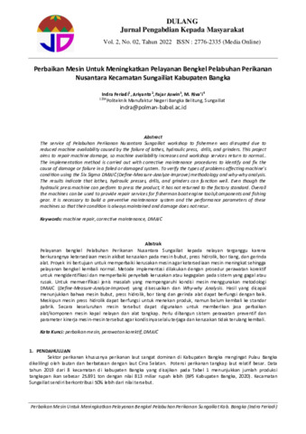 Indra Feriadi and Ariyanto and Fajar Aswin and M. Riva (2022) Perbaikan mesin untuk meningkatkan pelayanan bengkel pelabuhan perikanan nusantara Kecamatan Sungailiat Kabupaten Bangka. Dulang: Jurnal Pengabdian Kepada Masyarakat, 2 (2): 2. pp. 51-57. ISSN 2776-2335
