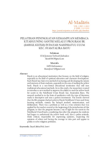 Mustafa, Mustafa (2022) Pelatihan peningkatan kemampuan membaca kitab kuning santri melalui program BK (Bahsul Kutub) di Dayah Nahdhatul Ulum Kec. Syamtalira Bayu. Al-Madaris : Jurnal Pendidikan dan Studi Keislaman, 3 (2): 1. pp. 1-11. ISSN 2745-9950