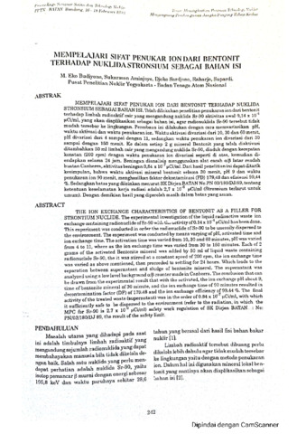 Telah dilakukan penelitian penukaran ion dan bentonit terhadap limbah radioaktif cair yang mengandung nuklida Sr-90 aktivitas awal 0,14 x 10⁻⁴ μCi/ml, yang akan diaplikasikan sebagai bahan isi agar radionuklida Sr-90 tersebut tidak mudah tersebar ke lingkungan. Percobaan ini dilakukan dengan cara memvariasikan pH, waktu aktivasi dan waktu penukaran ion. Waktu aktivasi divariasi dari 10, 30 dan 60 menit.pH divariasi dari 4 sampai dengan 11, sedangkan waktu penukaran ion divariasi dari 30 sampai dengan 150 menit. Ke dalam setiap 2 g mineral Bentonit yang telah diaktivasi ditambahkan 50 ml limbah cair yang mengandung nuklida Sr-90, diaduk dengan kecepatan konstan (200 rpm) dengan waktu penukaran ion divariasi seperti di atas, kemudian diendapkan selama 24 jam. Beningan dianalisis menggunakan alat cacah α/β latar rendah buatan Canberra, aktivitas beningan 0,84 x 10⁻⁷ μCi/ml. Dari hasil penelitian ini dapat ditarik kesimpulan bahwa waktu aktivasi mineral bentonit selama 30 meni,. pH 9 dan waktu penukaran ion 90 menit, menghasilkan faktor dekontaminasi (FD) 179,48 dan efisiensi 99,44 %. Sedangkan batas yang diizinkan menurut SK Dirjen BATAN No. PN 03/180/DJ/89, tentang ketentuan keselamatan kerja radiasi adalah 2,7 x 10⁻⁶ μCi/ml (Stronsium terlarut untuk umum). Dengan demikian hasil yang diperoleh masih dalam batas yang aman.