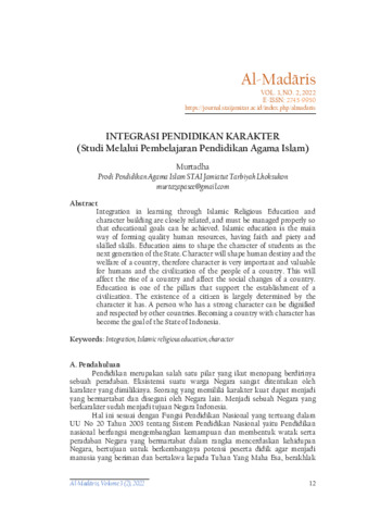 Murtadha, Murtadha (2022) Integrasi Pendidikan Karakter (studi melalui pembelajaran pendidikan agama Islam). Al-Madaris: Jurnal Pendidikan dan Studi Keislaman, 3 (2): 2. pp. 12-20. ISSN 2745-9950