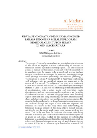 Zuraida, Zuraida (2022) Upaya peningkatan pemahaman konsep bahasa Indonesia melalui program remedial oleh tutor sebaya di MIN 11 Aceh Utara. Al-Madaris : Jurnal Pendidikan dan Studi Keislaman, 3 (2): 6. pp. 52-60. ISSN 2745-9950