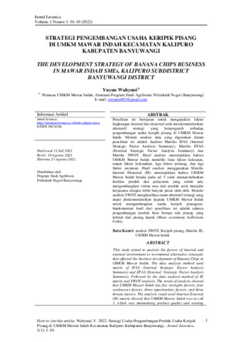 Penelitian ini bertujuan untuk menganalisis faktor lingkungan internal dan eksternal serta merekomendasikan alternatif strategi yang berpengaruh terhadap pengembangan usaha keripik pisang di UMKM Mawar Indah. Metode analisis data yang digunakan dalam penelitian ini adalah analisis matriks IFAS (internal strategic factor analysis summary), matriks EFAS (external strategic factor analysis summary) dan Matriks SWOT. Hasil analisis menunjukkan bahwa UMKM Mawar Indah memiliki lima faktor kekuatan, empat faktor kelemahan, tiga faktor peluang, dan tiga faktor ancaman. Hasil analisis menggunakan Matriks Internal Eksternal (IE) menunjukkan bahwa UMKM Mawar Indah berada pada sel 5 yaitu mempertahankan kualitas produk dan pelayanan yang sudah ada,mengembangkan varian rasa dari produk serta menjalin kerjasama dengan lebih banyak pusat oleh-oleh. Metode analisis SWOT menghasilkan enam alternatif strategi yang dapat direkomendasikan kepada UMKM Mawar Indah untuk mengembangkan usaha keripik pisangnya.Implementasi hasil dari penelitian ini adalah adanya pengembangan produk baru berupa sale pisang yang terbuat dari pisang kepok (Musa acuminata balbisiana Colla).
