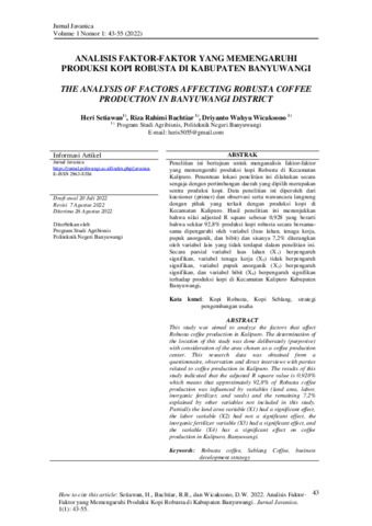 Heri, Setiawan and Riza, Rahimi Bachtiar and Driyanto, Wahyu Wicaksono (2022) Analisis faktor-faktor yang memengaruhi produksi kopi robusta di Kabupaten Banyuwangi. Jurnal Javanica: Jurnal Terapan Agribisnis, 1 (1): 5. pp. 43-55. ISSN 2963-8186