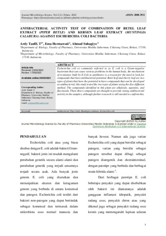 Ardy, Tanfil. T and Ema, Hermawati and Ahmad, Subagiyo (2022) Antibacterial activity test of combination of betel leaf extract (Piper betle) and kersen leaf extract (Muntingia calabura) against Escherichia coli bacteria. Journal Microbiology Science, 2 (2): 1. pp. 1-7. ISSN 2808-392X