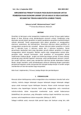 Sahwan, Luriadi and Muhammad, Irwan and Sahri, Sahri (2022) Implementasi prinsip ta’awun pada budaya banjar untuk pemberdayaan ekonomi ummat (studi kasus di Desa Santong Kecamatan Terara Kabupaten Lombok Timur). Jurnal Oportunitas, 1 (2): 4. pp. 44-62. ISSN 2829-2847